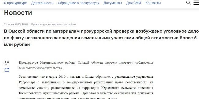 10 июля 2023 года Кормиловский районный суд Омской области в составе судьи Ульяны БОЧАРОВОЙ вынес заочное решение по иску прокурора Кормиловского района к Ивану ТВЕРИТИНУ о признании сделок купли-продажи пяти земельных участков недействительными и применении последствий недействительных сделок.