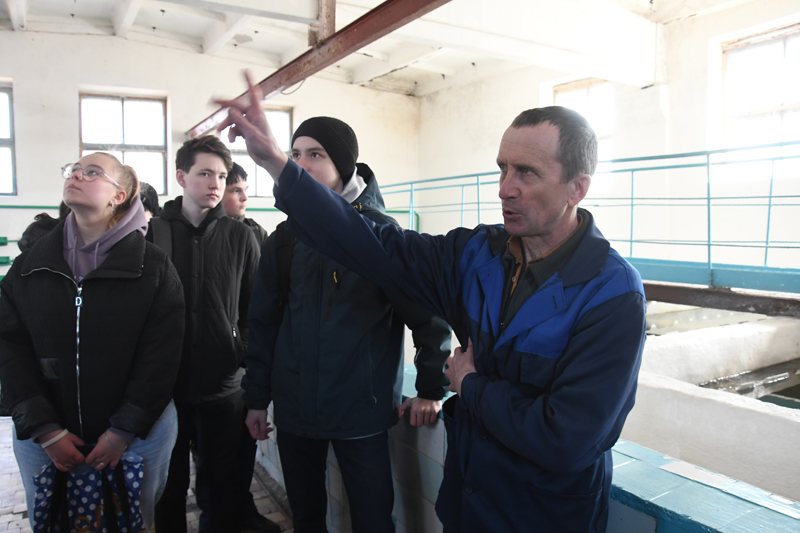 Вначале юные экскурсанты поднялись на второй этаж станции второго подъема водоканала, где Андрей Романович Пузынин, машинист станции, показал, как происходит фильтрация воды: