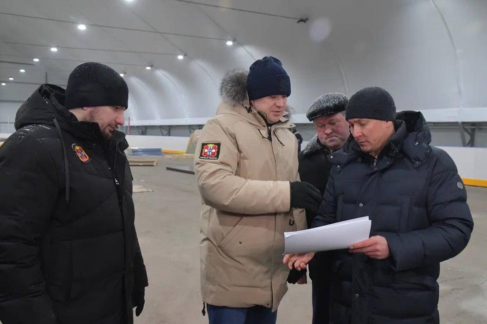 Первым пунктом рабочей поездки стала территория стадиона, на территории которого возводится новое спортивное сооружение. Ледовая арена крытого хоккейного корта будет использоваться и в зимние, и летние месяцы.