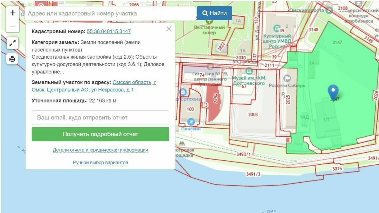 Фото: Скриншот с сайта Публичной кадастровой карты Омской областиИ, наконец, на третьем земельном участке с кадастровым номером 55:36:040115:3 уже стоит шестиэтажный жилой дом (изначально он планировался как административное здание). Застройщиком объекта на улице Победы, дом 5, корпус 1 являлось ООО «Проектно-строительное объединение „Архитектурно-строительный комплекс“. Компанию зарегистрировали еще в 2003 году, с 2014 года директором в ней значится Андрей Рудаев.