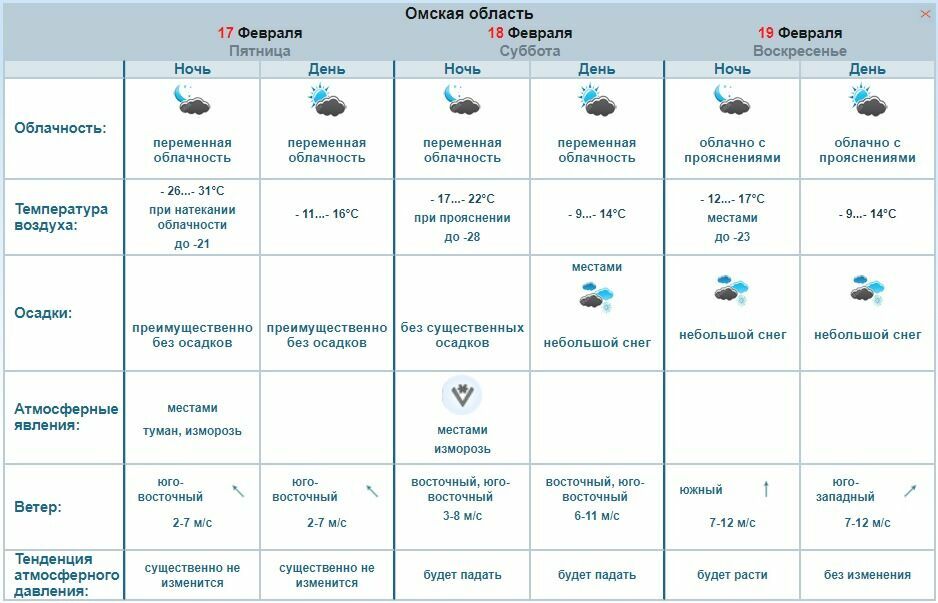 иллюстрация Фото: omsk-meteo.ruВ пятницу, 17 Февраля будет преимущественно без осадков. Ветер юго-восточный 2-7 м/с. Ночью местами туман и изморозь, температура -26 до -31 градусов (при натекании облачности до -21). Температура днем от -11 до -16 градусов.