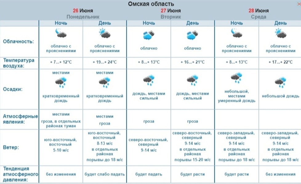 прогноз погоды Фото: Обь-Иртышское УГМСОтметим, в Омской области по 26 июня сохраняется опасное явление — пятый класс горимости. Также 25 июня до 10:00 в регионе был объявлен режим неблагоприятных метеоусловий. Это период слабого ветра, когда вредные примеси плохо рассеиваются в воздухе. Традиционно время жалоб на выбросы от горожан.