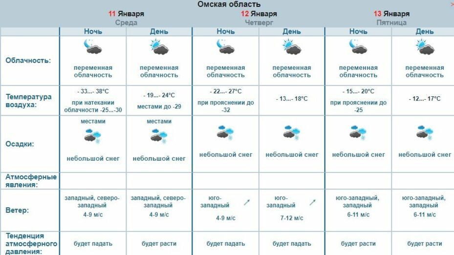 В четверг, 12 января, столбик термометра покажет днем до -18, а ночью -27 градусов, ожидается небольшой снег. К пятнице погода станет еще теплее: днем до -17, а ночью до -20 градусов, юго-западный ветер до 9 м/с, также осадки в виде снега.