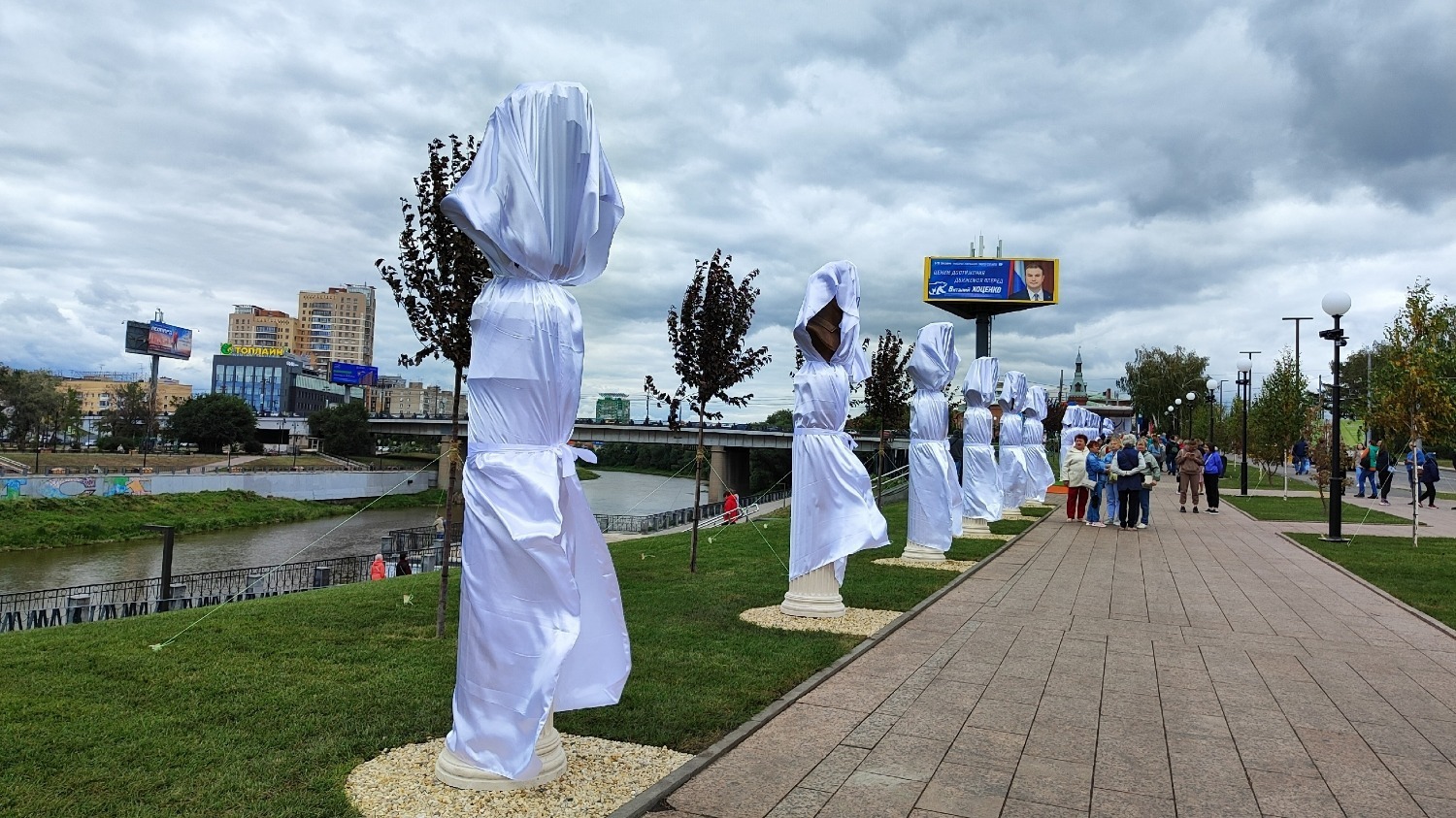 Пока депутаты, политики, омские спортсмены и гости города смотрели концерт в зале филармонии, на набережной шли последние приготовления: зачем-то помыли асфальт, а скульптуры скрывались под белой тканью.