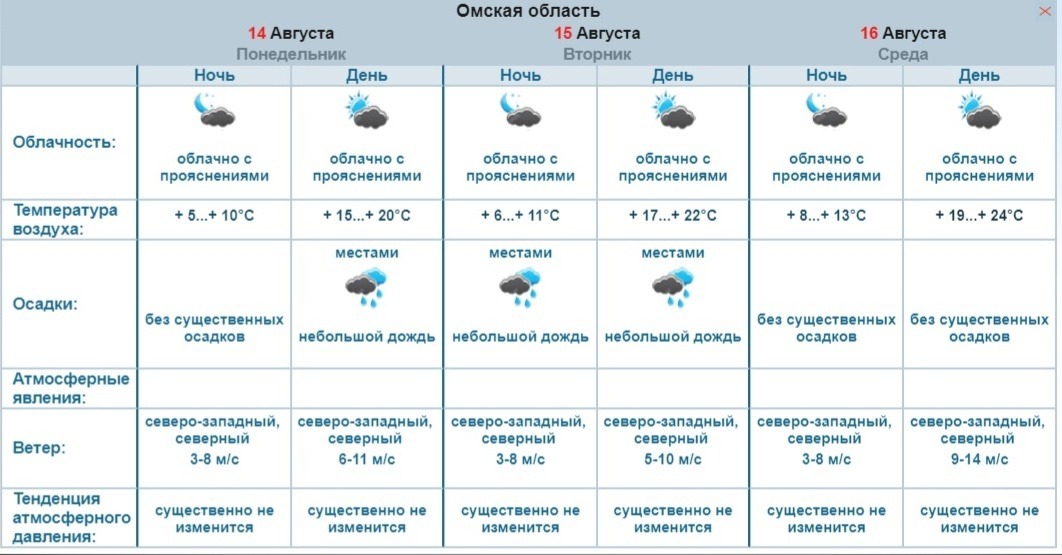 Во вторник в дневные часы потеплеет до +22 градусов. Местами по области возможен дождь. А вот днем 16 августа осадков не ожидается. Столбик термометра поднимется до +24. Порывы ветра усилятся до 14 метров в секунду, согласно прогнозу Обь-Иртышского УГМС.