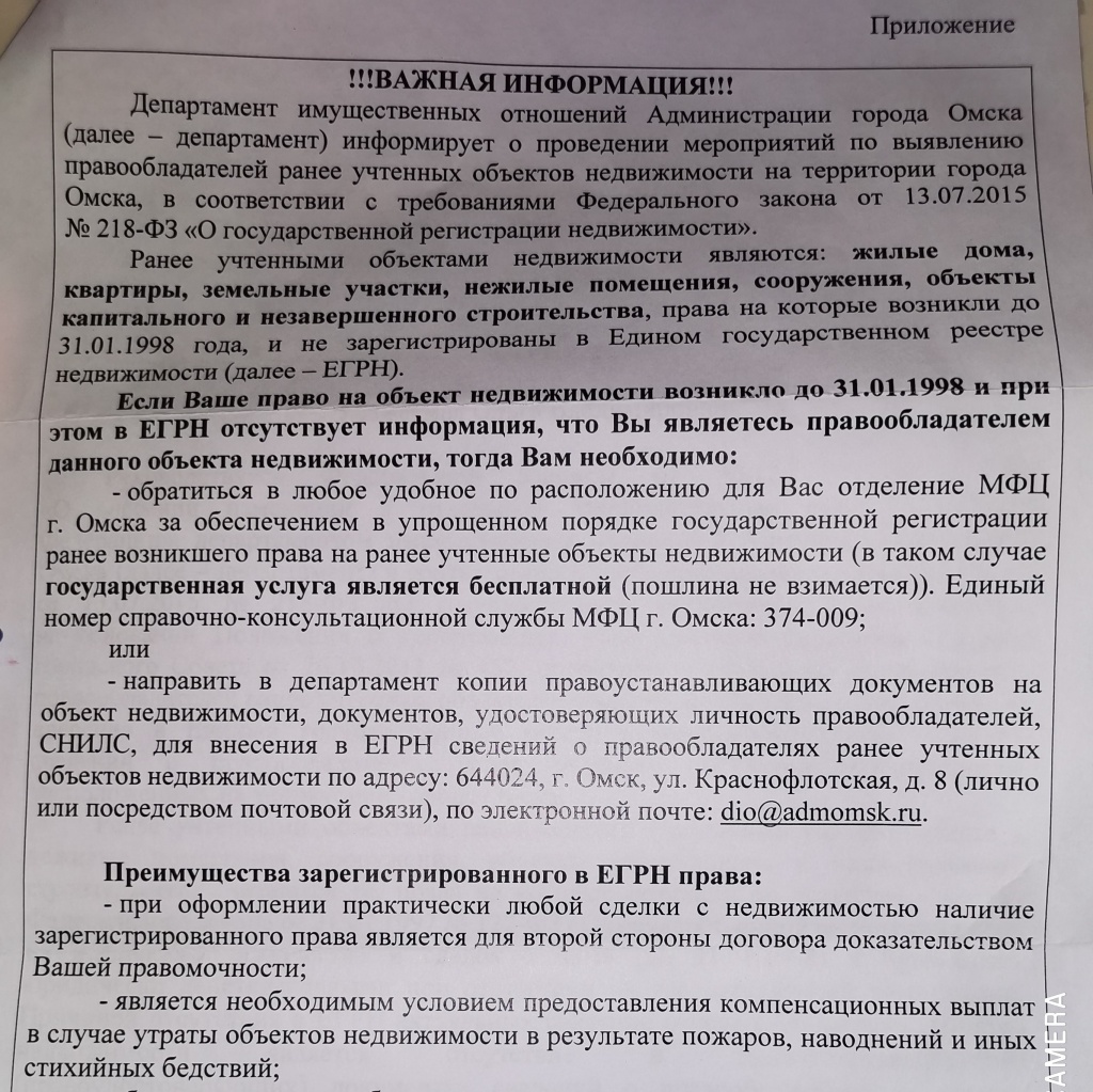 "В адрес комитета ТОС" Аграрный" поступило письмо из департамента имущественных отношений Администрации города Омска, целью которого было информирование жителей о такой важной процедуре, как регистрация права собственности. Очень часто бывает так, что человек, имея на руках правоудостоверяющие документы, выданные до 31.01.1998 не регистрирует свой объект в Едином государственном реестре недвижимости и в последующем у такого собственника объекта недвижимости могут возникнуть проблемы при сделке с недвижимостью (дарение, продажа). Департаментом имущественных отношений была предоставлена памятка, в которой специалисты отобразили полезную информацию для регистрации права собственности. Надеюсь, что она будет полезной для наших жителей", - сказала председатель комитета ТОС "Аграрный" Запрягаева Ольга Владимировна.