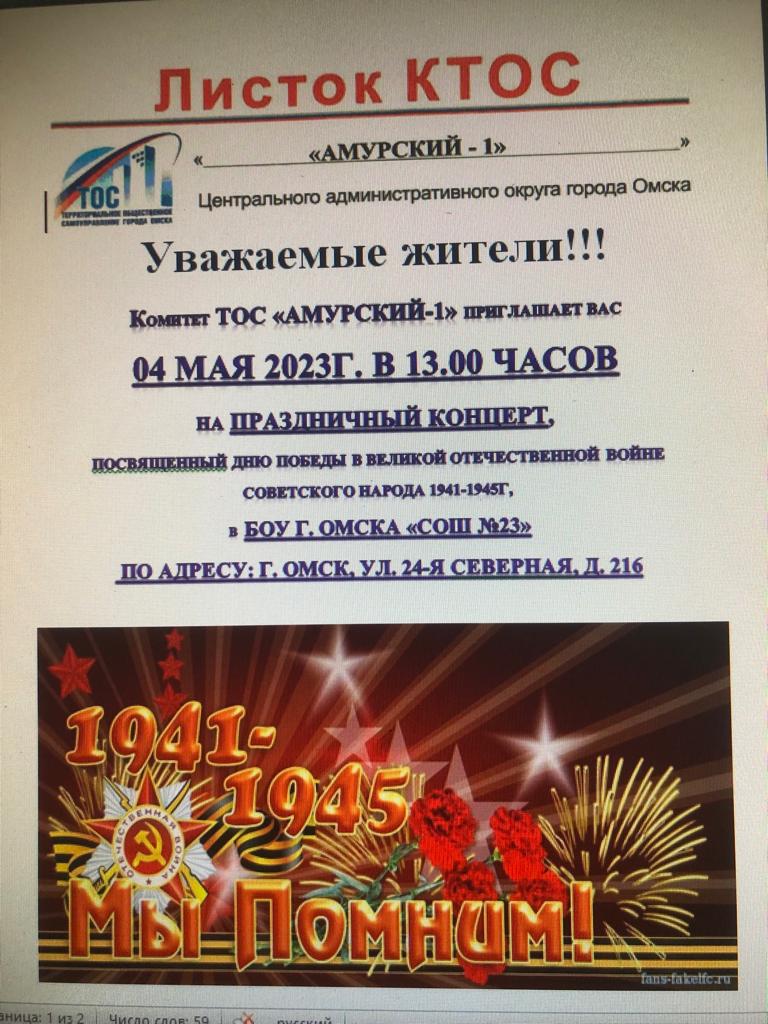 КТОС «Амурский-1» приглашает жителей микрорайона 5 мая в 13.00 на праздничный концерт, посвященный 78 годовщине Дня Победы по адресу:г. Омск, ул. 21-я Амурская, д.2А.