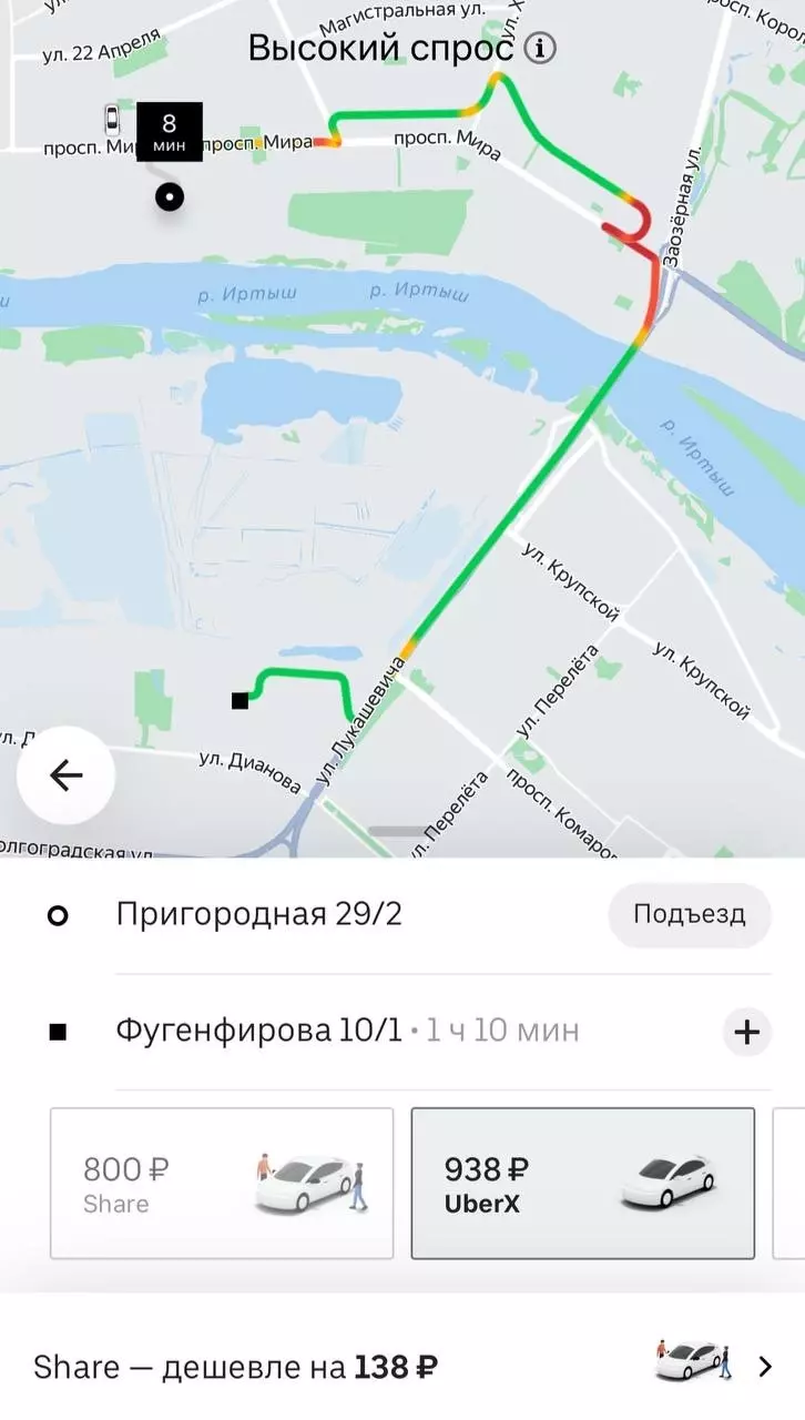 Так, из Нефтяников на Левый берег и в центр города добраться будет весьма проблематично. Стоимость поездки оценивается в 900-1000 рублей, при это ехать придется не меньше часа. Вероятно, все из-за пробки на подъезде к мосту им. 60-летия ВЛКСМ. Проспект Мира на картах окрашен в бордовый цвет, также «стоит» и улица Заозерная.