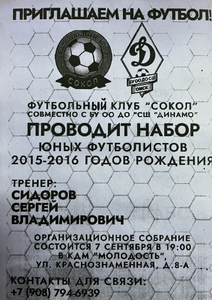 КТОС "Первокирпичный" информирует о том, что футбольный клуб "СОКОЛ" совместно с БУ ОО ДО "СШ "ДИНАМО" проводит набор юных футболистов 2015-2016 г. рождения.