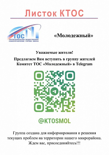 Для оперативного решения проблем на территории нашего микрорайона, комитет ТОС «Молодежный» создал группу жителей в мессенджере Telеgram. В группе мы размещаем интересную и полезную информацию, приглашения на мероприятия, объявления, обсуждаем и решаем насущные вопросы.