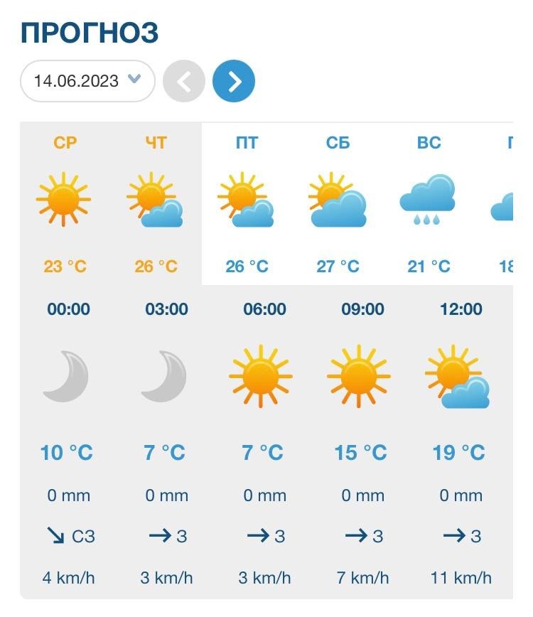 скриншот Фото: VentuskyЗавтра, 14 июня, прогнозируется переменная облачность, преимущественно без осадков. Ветер — 8-13 м/с, воздух в дневное время прогреется до 26 градусов тепла. На следующий день, 15 июня, такая же жара будет стоять на большей части Омска и области, однако местами ожидается гроза и кратковременный дождь.