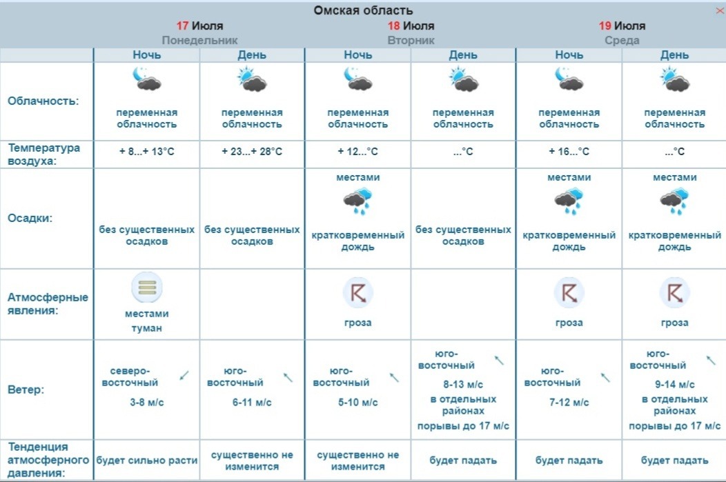 В Омске ожидаются туман, дожди и грозы В привычных блоках прогноза отсутствуют температурные значения.