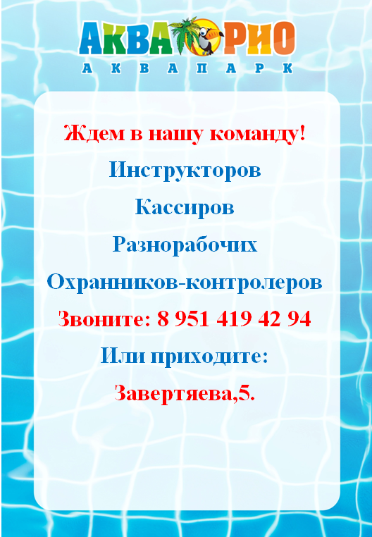 КТОС "Первокирпичный" предлагает ознакомиться с вакансиями предлагаемых "Аква РиО"; спорт парк "Реформа" и GASTRO-PUB "Шале". Подробная информация по телефону указанному ниже в памятках.