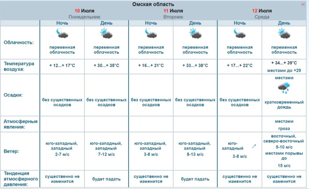 11 июля днем потеплеет до +38. А в среду даже до +39 градусов. Местами 12 июля ожидается кратковременный дождь, гроза. В отдельных районах ветер усилится до 15 метров в секунду, похолодает до +29, передает Обь-Иртышское УГМС.