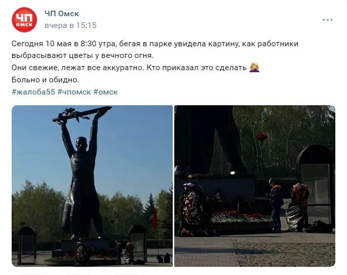 Омичи задались вопросом, почему же на следующее утро после Дня Победы нужно сразу убирать цветы с вечного огня. Автор поста в паблике «ЧП Омск» выразил свои эмоции, сказав, что ему больно и обидно. Многие пользователи в комментариях отметили, что так быстро лучше бы в городе убирали мусор.